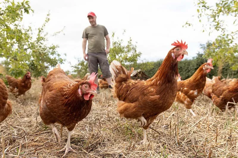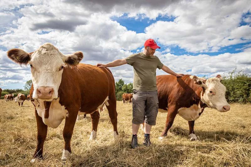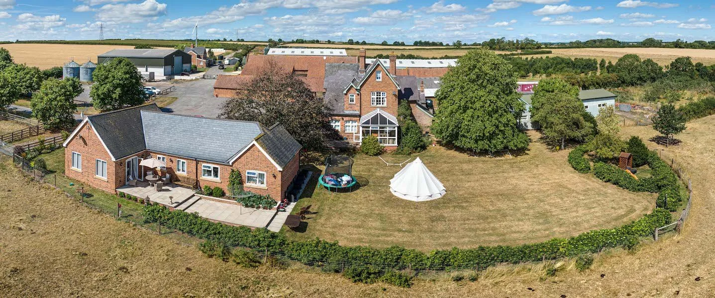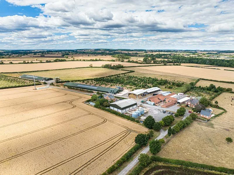 Show the full extent of the property in the best light, plus the farmer out with the animals.